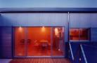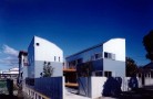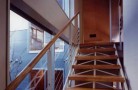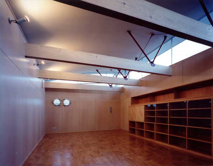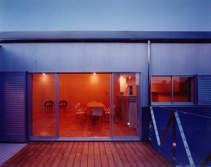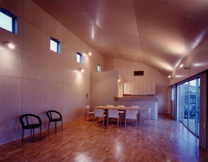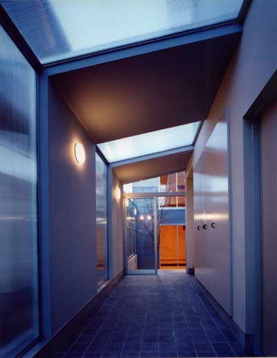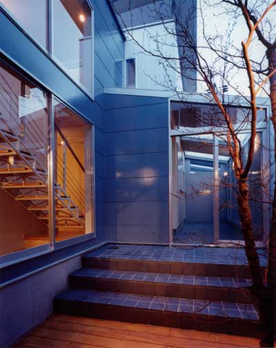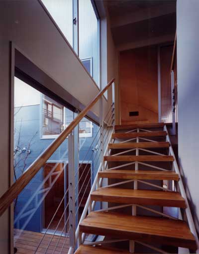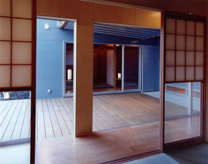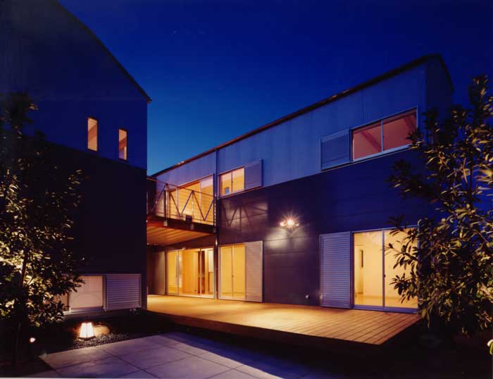 周辺の文脈と建主の与条件を整理して建物を一体型とせず、3つのブロックに分割した。それぞれを繋ぐ空間構成としながら多彩な場面を導く装置をその繋ぎの部分に点在させることで、豊かさを引き出す空間を新たに構築しようと試みた。この住宅は二世帯住宅であり、親世帯夫婦と子供世帯夫婦と子供3人の家族構成である。親世帯のゾーンは1階に構え、子世帯のゾーンを2階としながら夫婦と子供のゾーンをそれぞれのブロックに分割した。南側の中庭のデッキ空間は、各フロアー毎においては、視覚的繋がりと空間に拡がりをもたらし、上下フロアー間の繋がりにおいては、気配を共有しながら、双方の存在を無意識のうちに認知していられる空間へと誘ってくれる、そういう両世帯の家族の繋がりをこのデッキ空間において可能にしたいと考えた。